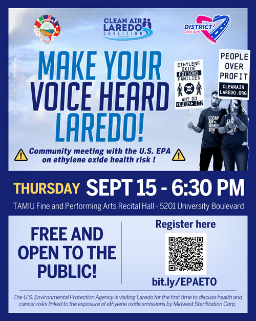 The Clean Air Laredo Coalition - which was formed last year to address the cancer threat from ethylene oxide (EtO) emissions - encourages parents, elected officials, and all members of the community to attend, ask questions, and get informed. EtO is a mutagenic DNA-damaging gas. Midwest Sterilization Corp., a Jackson, Missouri-based company, opened in Laredo in 2005 and has emitted thousands of pounds into our air every year.